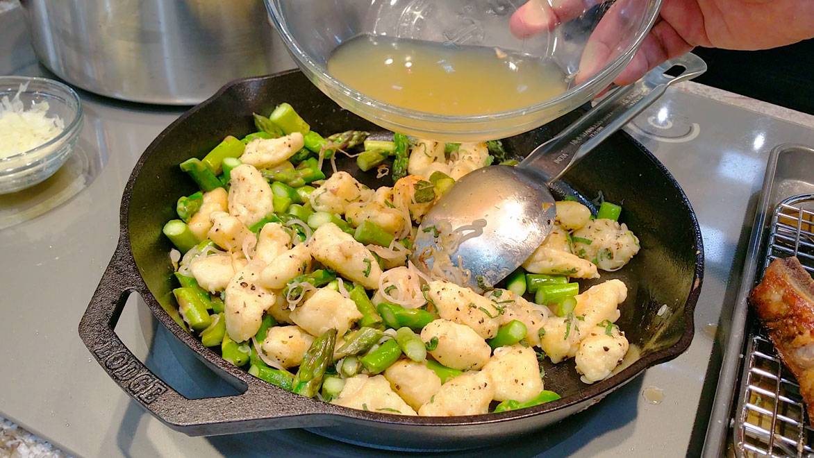 Anyway, when they are cooked and drained, add them to your porky and buttery pan you took the chops out of. Add a pound of asparagus cut into 1 inch pieces, a tablespoon of chopped sage and a thinly sliced shallot. Season with S P and stir until everything starts to brown. Add a little chicken stock to deglaze, maybe a 1/4 cup.
