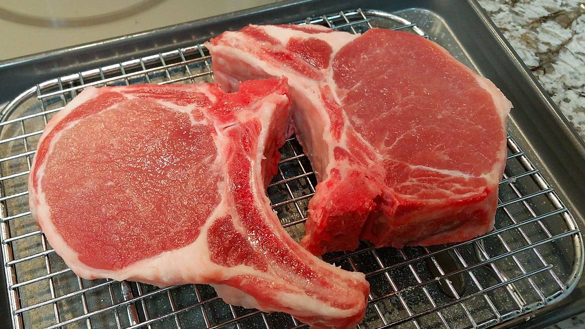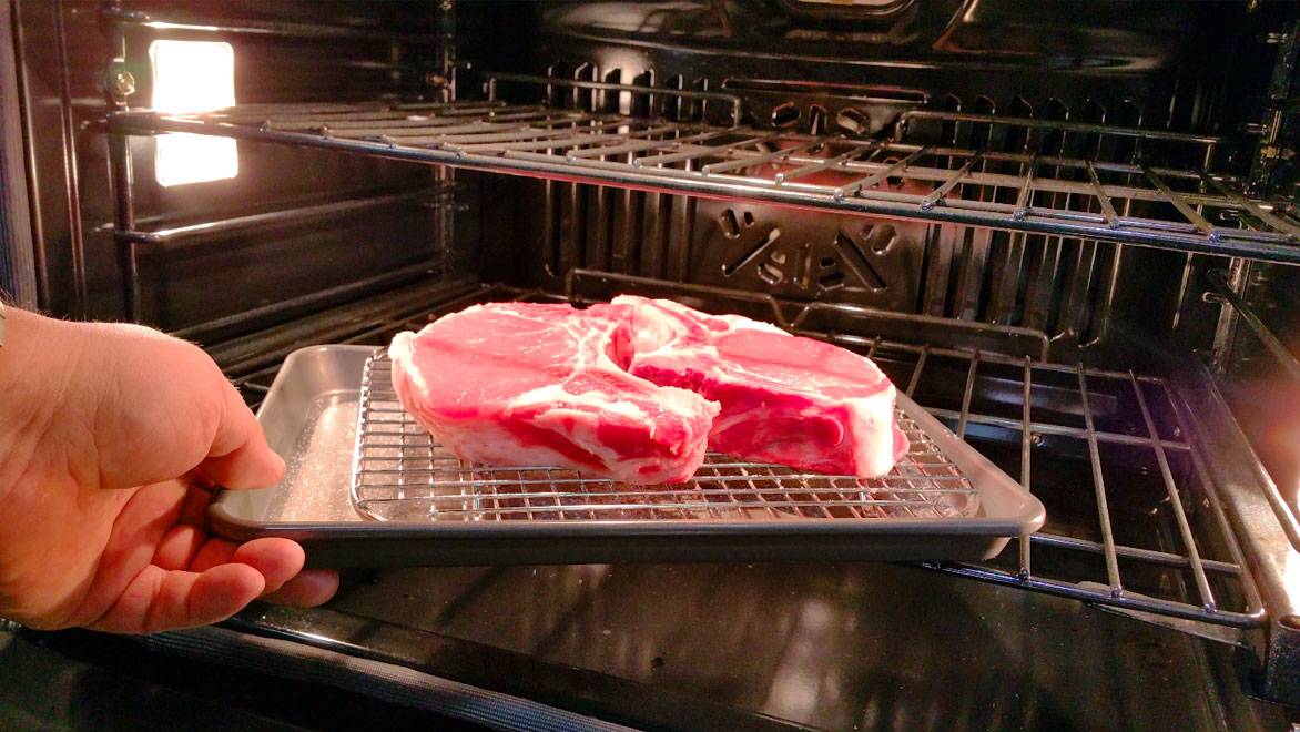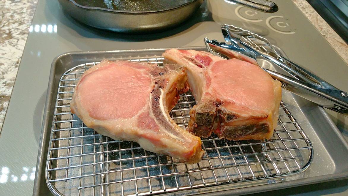OK, it's tomorrow. Remove the chops from the fridge, pat dry, and preheat your oven to 225 degrees. Don't worry about "warming up" the chops before you cook them, or any such nonsense, because that doesn't work either.