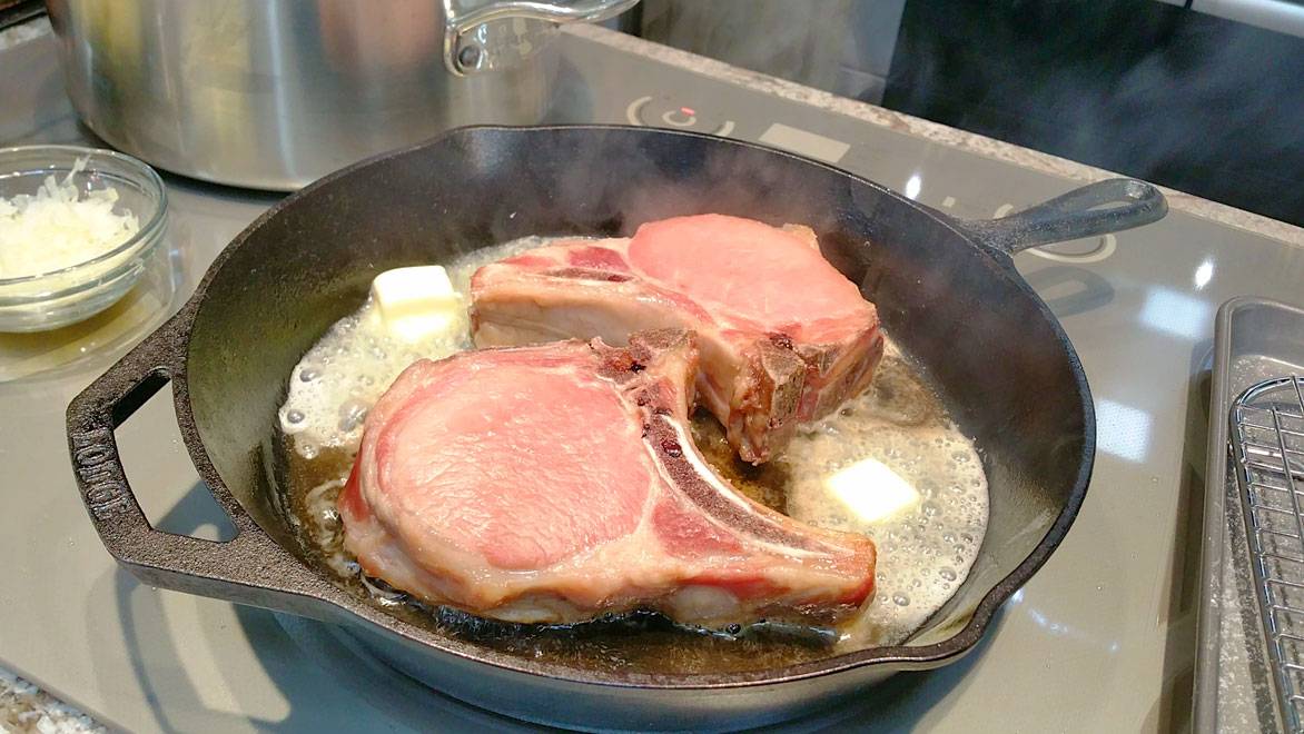 As soon as you drop the chops into your blistering hot skillet, drop in two tablespoons of butter to go with. Leave the whole thing alone for 90 seconds.