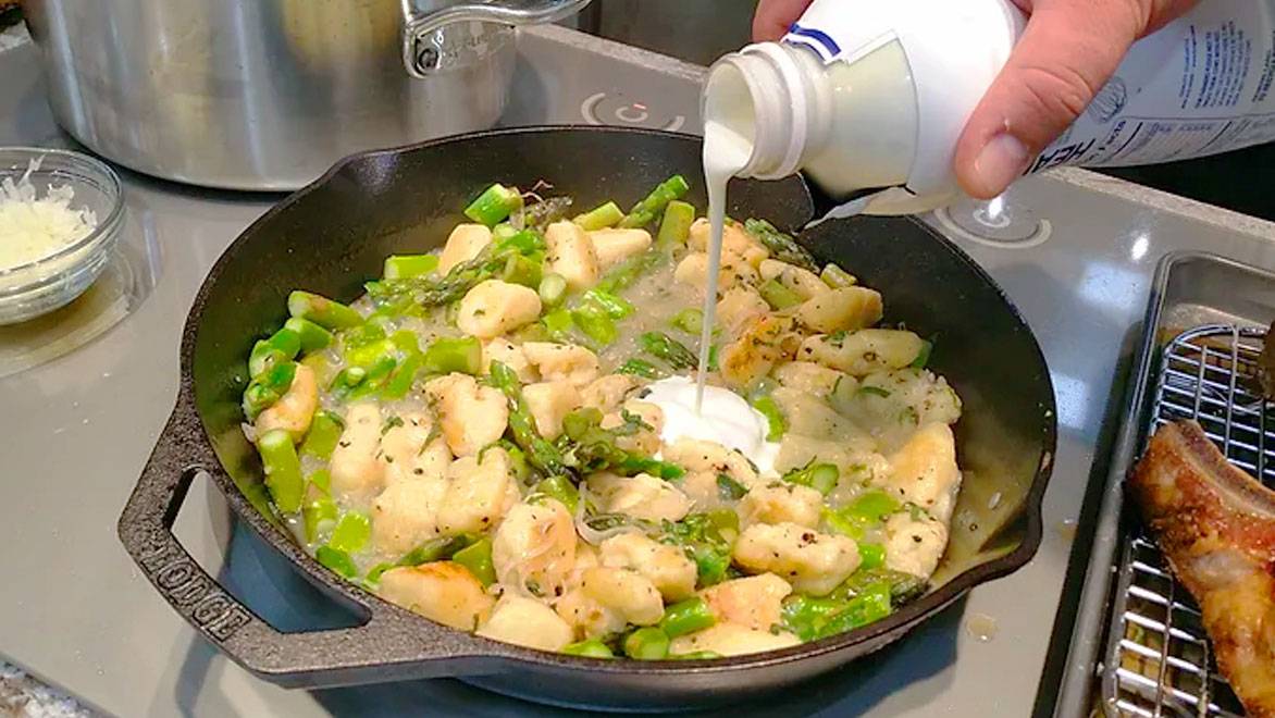 While we're at it, we should have a lovely spring pasta dish. While your pork chops are in the oven, put a pot of water on to boil. and cook some gnocchi according to the package directions.