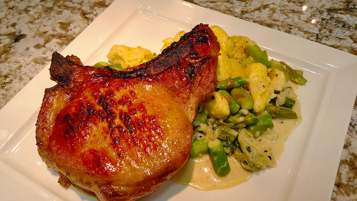 Plate the seared chop on top of the gnocchi, and lay your lips on the most succulent pork chop you've ever tasted, followed by a bite of spring.