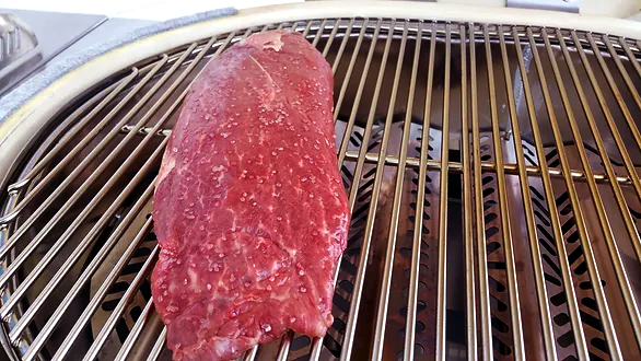 Let's begin: Set your grill up for two zone cooking. Season a flat-iron steak with coarse salt and cook on the cool side of the grill (approximately 225 degrees) until it hits about 120 degrees. The outside will dry a little, and the inside should be very rare.