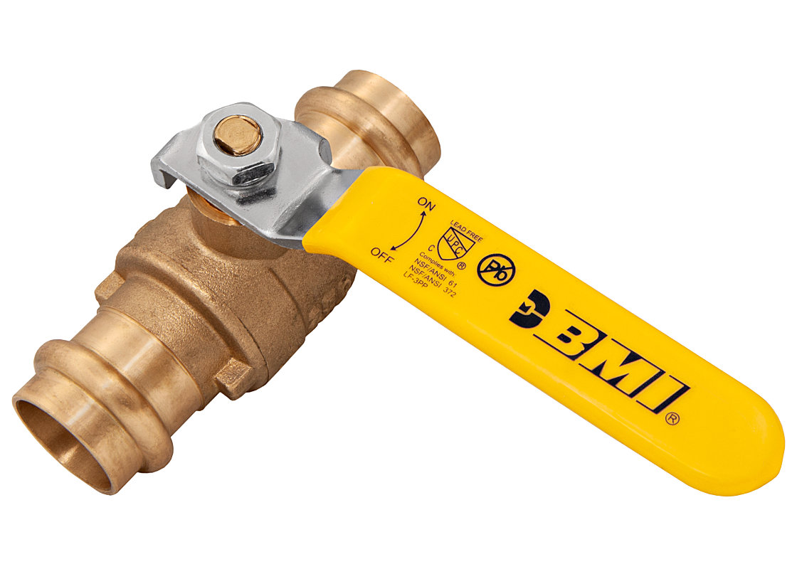 BMI® Ball Valve, Lead-Free Straight, 3/4 in Nominal, Press-Fit End Style, 250 psi Pressure, -20 to 300 deg F, Full Port, 304 Stainless Steel Ball, 3.6 in Inlet to Outlet Length, 2.09 in Top to Inlet Center, Brass Body, Zinc Plated Steel Handle Nut/Lock Washer, Steel Handle, C37700 Lead-Free Brass Packing Nut/Stem Trim, PTFE Packing/Seat, NBR Stem O-Ring, EPDM O-Ring Softgoods, Polished Chrome