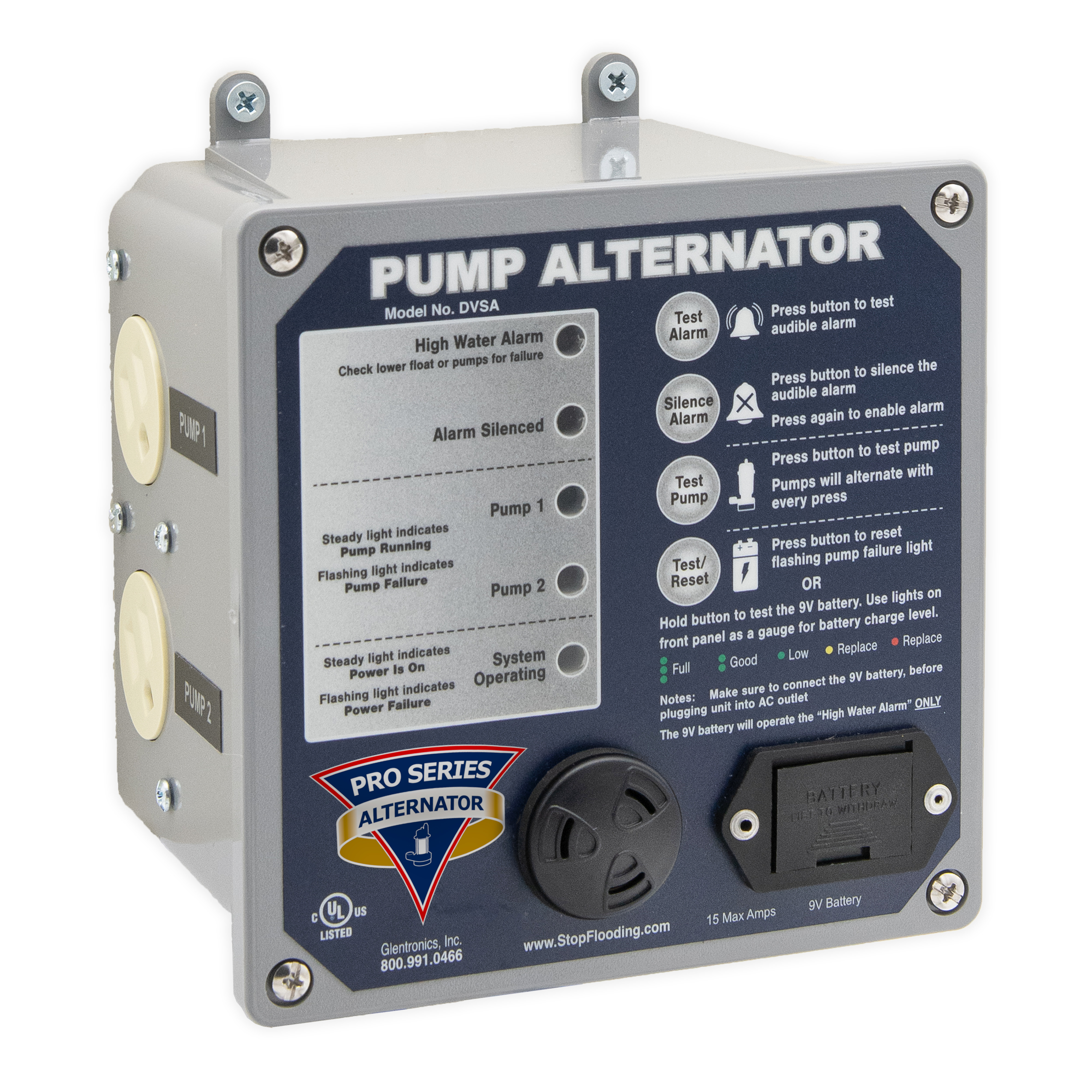 The Pro Series Pump Alternator is designed to operate two primary pumps. Every time the float switch is activated, it will automatically alternate the pump that turns on. This will prolong the life of both pumps. If one of the pumps fails to turn on, the Alternator will automatically switch to the other pump. If this occurs three times in a row, a light will start flashing indicating exactly which pump is failing.