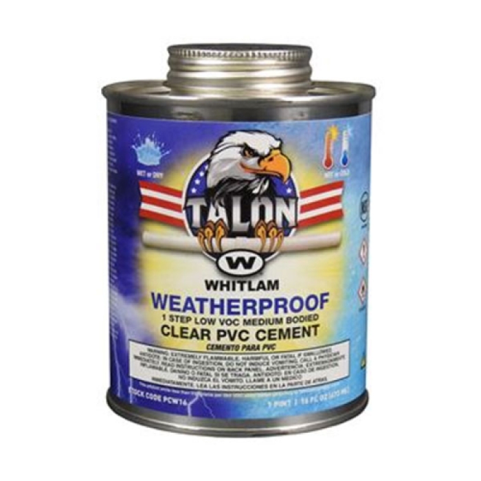 Weatherproof all weather low VOC clear medium bodied PVC cement is a fast setting cement that is formulated for wet or dry conditions and/or conditions where quick pressurization is desired. Weatherproof is an all-weather cement, suitable for temperature well below 0 deg F (-18 deg C) to well over 120 deg F (49 deg C).